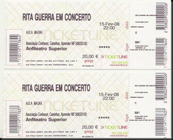 Tinha razão no feeling que senti: eram dois bilhetes para um concerto da Rita Guerra, Aula Magna, 15 Fevereiro. Há muito que ela sabe que gosto bastante da Rita Guerra, de romântico lamechas que sou. Perguntei á minha filha para quem eram, adivinhando, alegremente, a resposta. "Para nós", disse-me, "Devia estar maluca quando os comprei, para irmos os dois juntos ao concerto, com as vergonhas que tantas vezes me fazes passar".